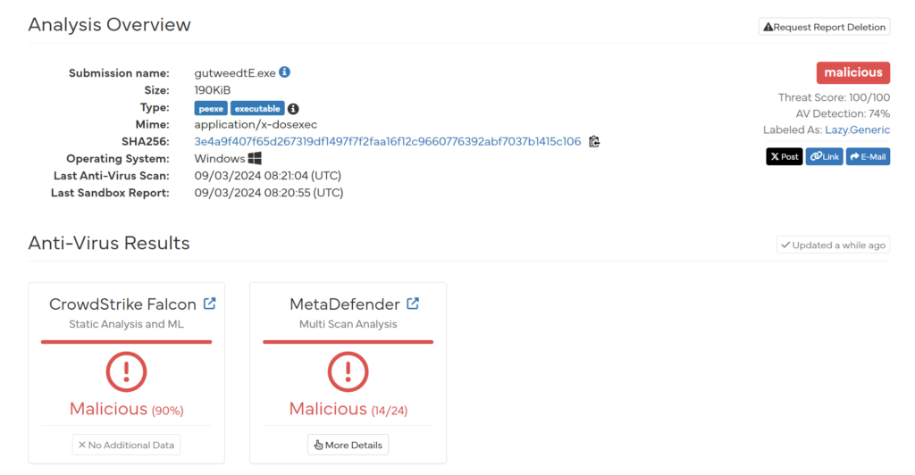 Hybrid Analysis does detect the file to be malicious: Free Automated Malware Analysis Service – powered by Falcon Sandbox (hybrid-analysis.com)