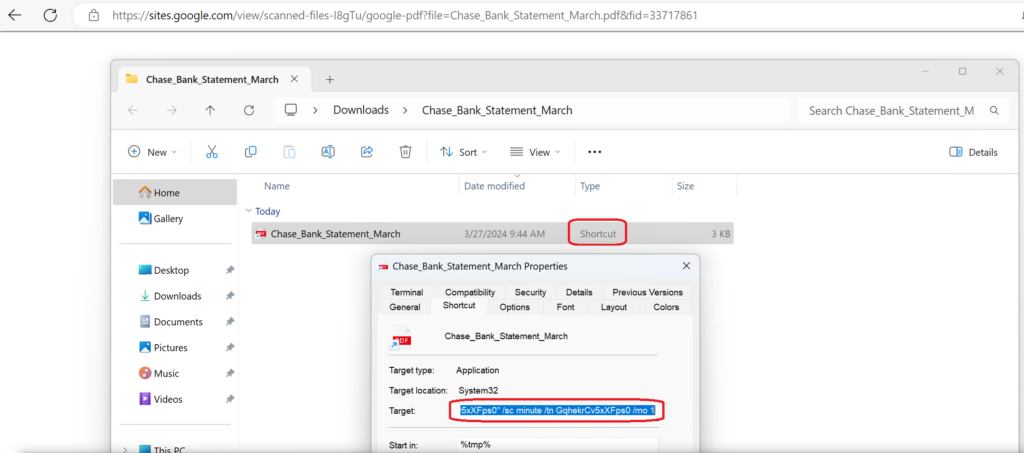 The shortcut executes a command to download a batch file XhFYm3tTsdlS.bat from a remote server and creates schedules a task to run the batch file every minute.