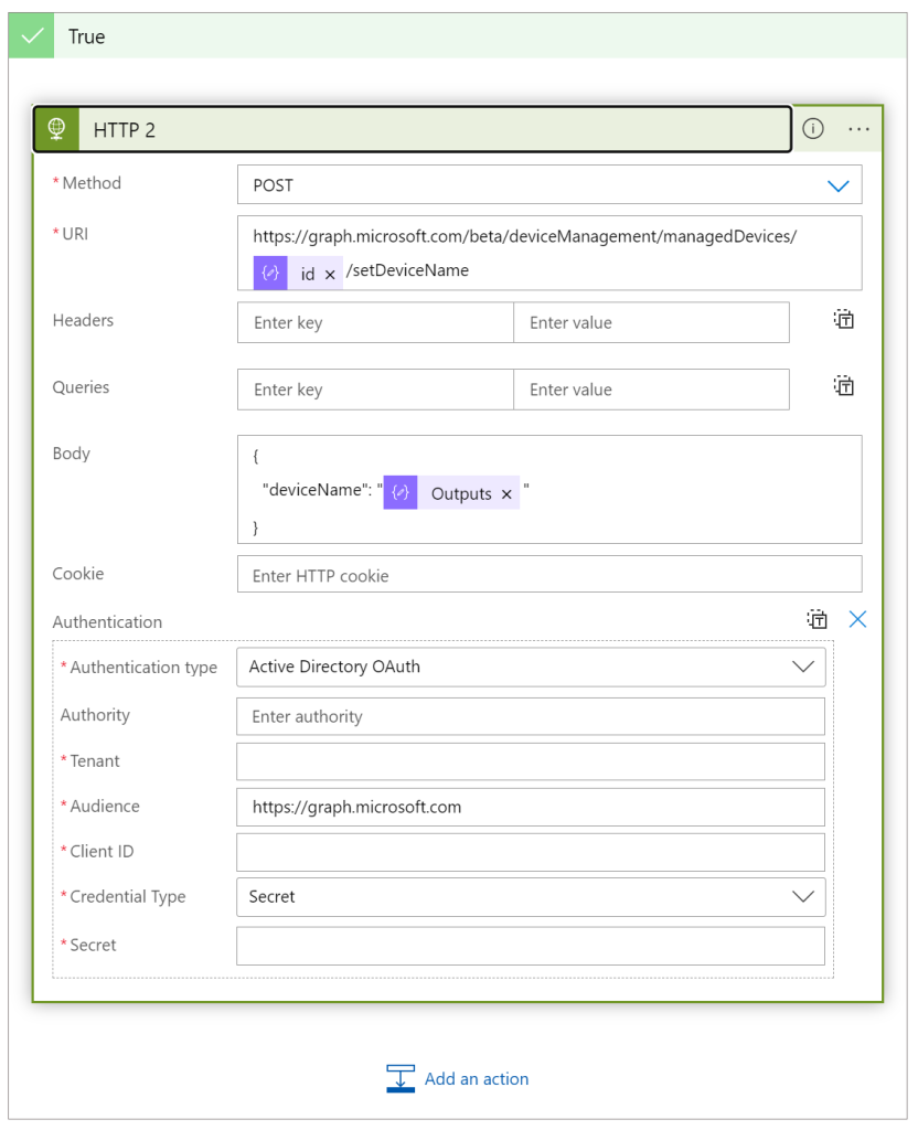 This HTTP action requests all device information, fill the details from the app registration in the green squares.