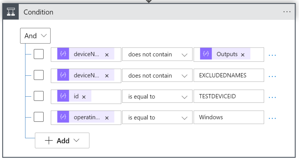 Finally, create a condition where we verify if the device name is not already matching the the user’s upn, and exclude certain computernames from the action. In this block, you can also add an deviceid you want to test with.