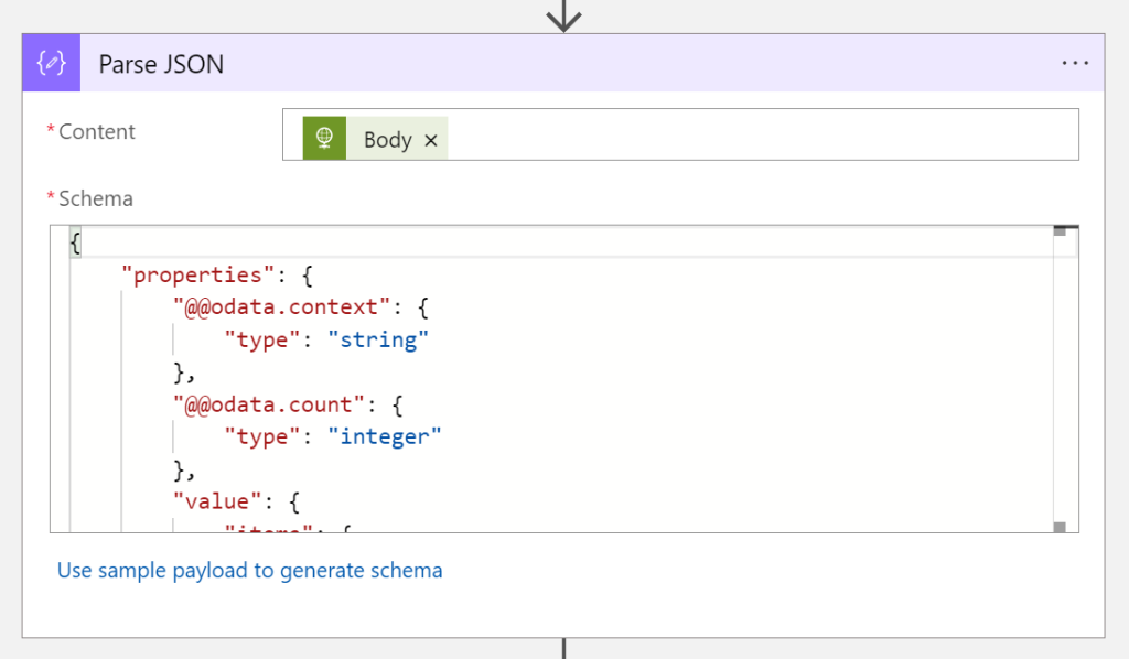 Next, we parse the JSON information that we’ve just received from the Graph action.