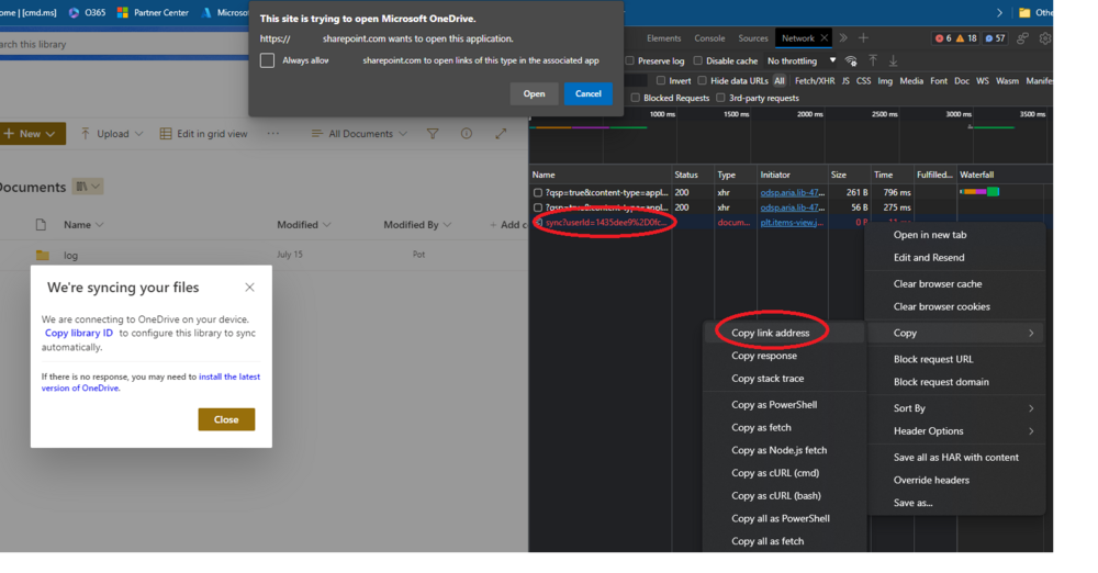 4. Two popups will open, which you can ignore, we’re interested in the red sync line in the Network tracer tab. Right click and copy the address: