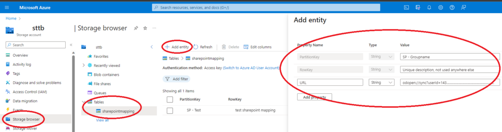 The Partition key should contain the Azure AD Group you want the folder linked to, Rowkey can be anything but should be unique, paste the entire odopen url in the URL field.