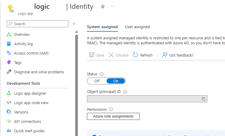 Start with creating a logic app and assign it a “System Assigned ID” as shown below in the screenshot.