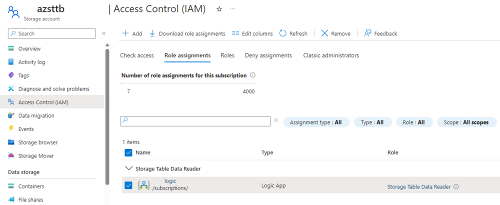 Create a Storage Account, and assign the system managed ID Storage Table Data Reader.