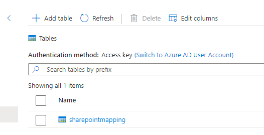 Go to Storage Explorer, tables and create a new table named “sharepointmapping”.