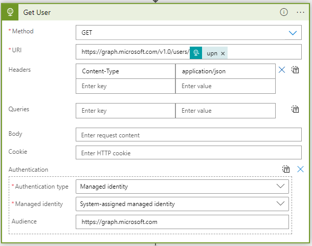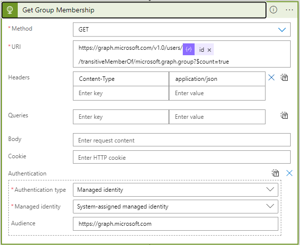 With the UPN received from the PS script, we will now request Azure AD with detailed information we need to request the group membership. The green window indicates it’s an HTPP Request.