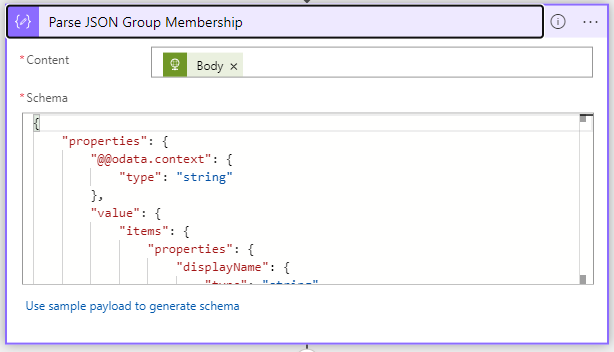 Purple windows are parse json actions. With this action we grab the ID of the user only, as we don’t need the other information: