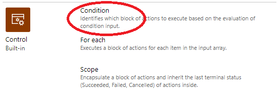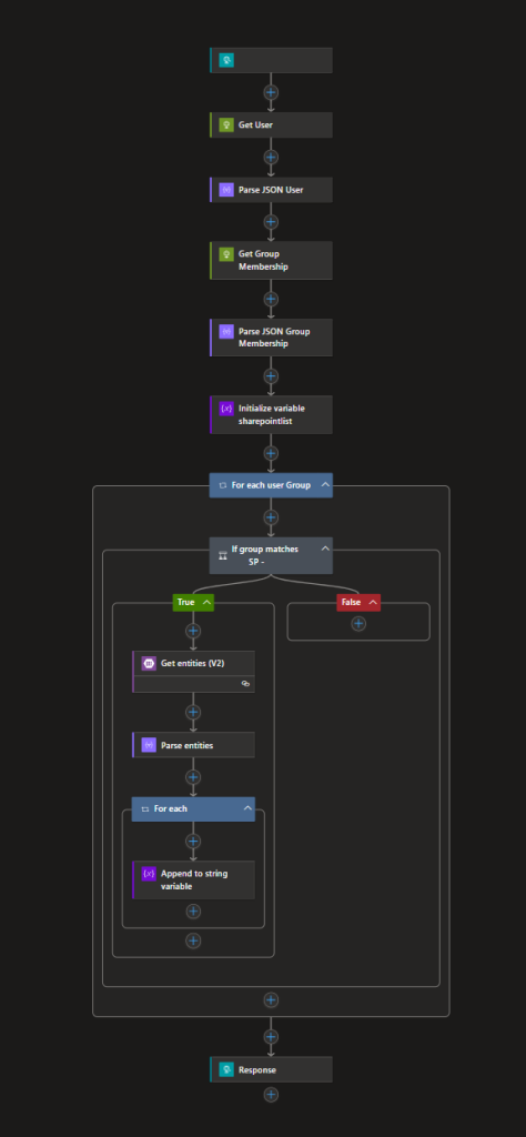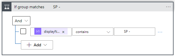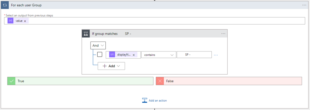 As soon as you’ve selected the displayName, the Logic App Designer will create a loop, which executes the True block, if the group matches the ‘SP -‘ prefix, which we will use for site assignments.
