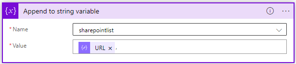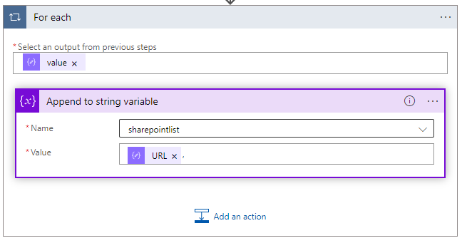 The next action is another loop, we will append the URL that’s parsed from the previous action to the sharepointlist variable created earlier, followed by an comma.   ,